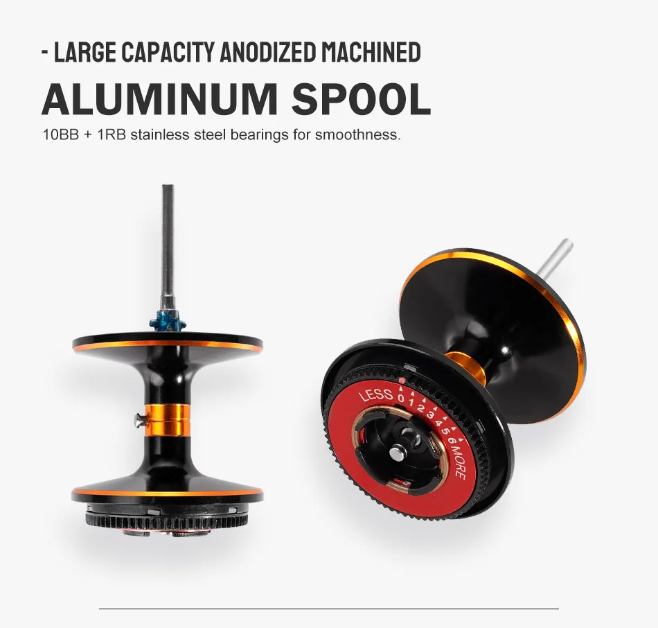 Large capacity anodized machined aluminum spool 10BB+1RB stainless steel bearings for smoothness.