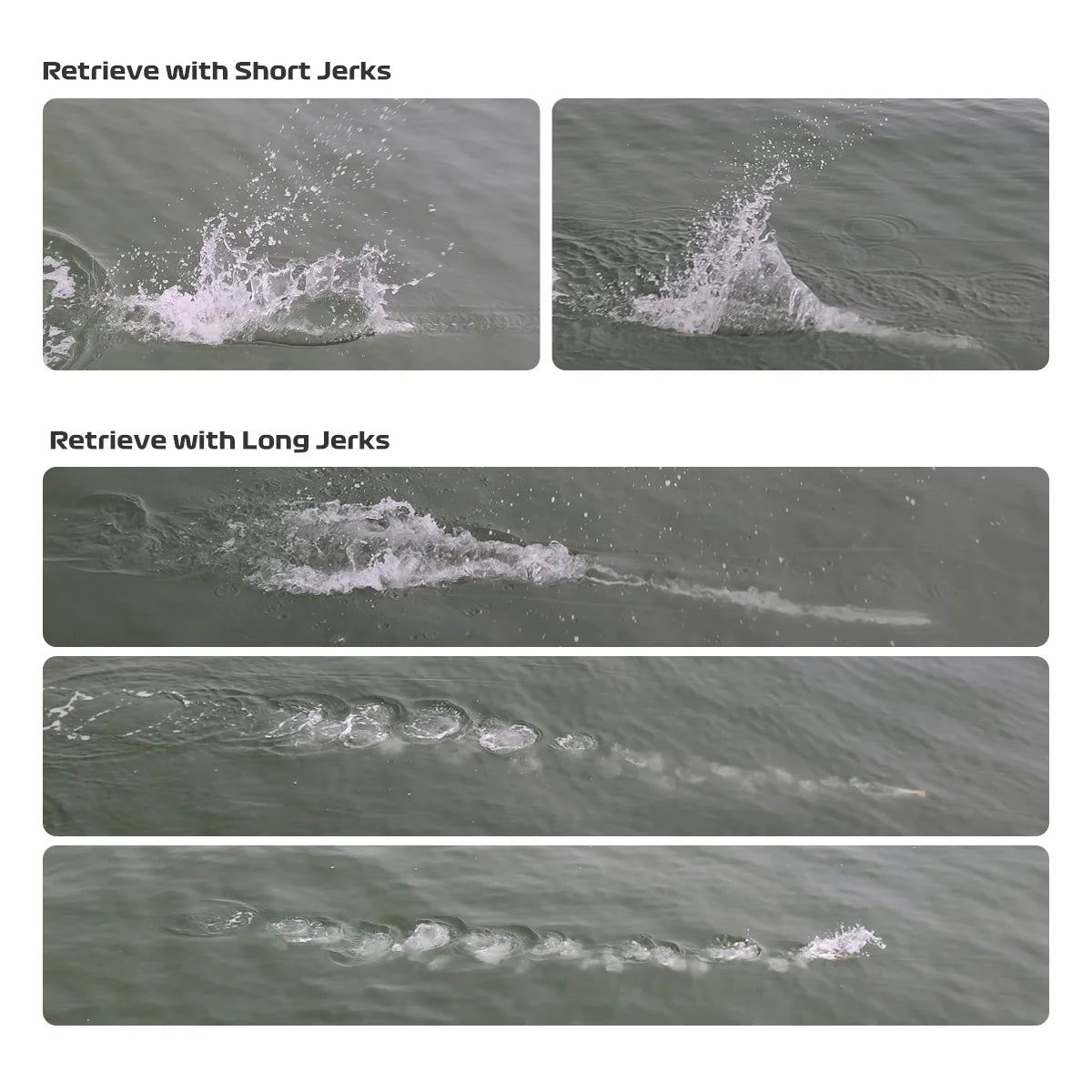 Perfect for Stop& go retrieve; Pause/Jerk/Pop technique; Fast popping retrieve.