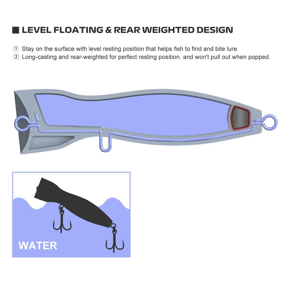 2- Long-casting and rear-weighted for perfect resting position, and won't pull out when popped.