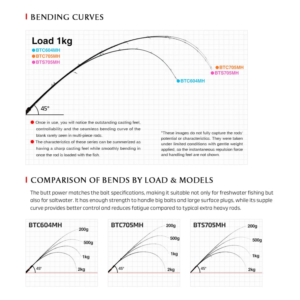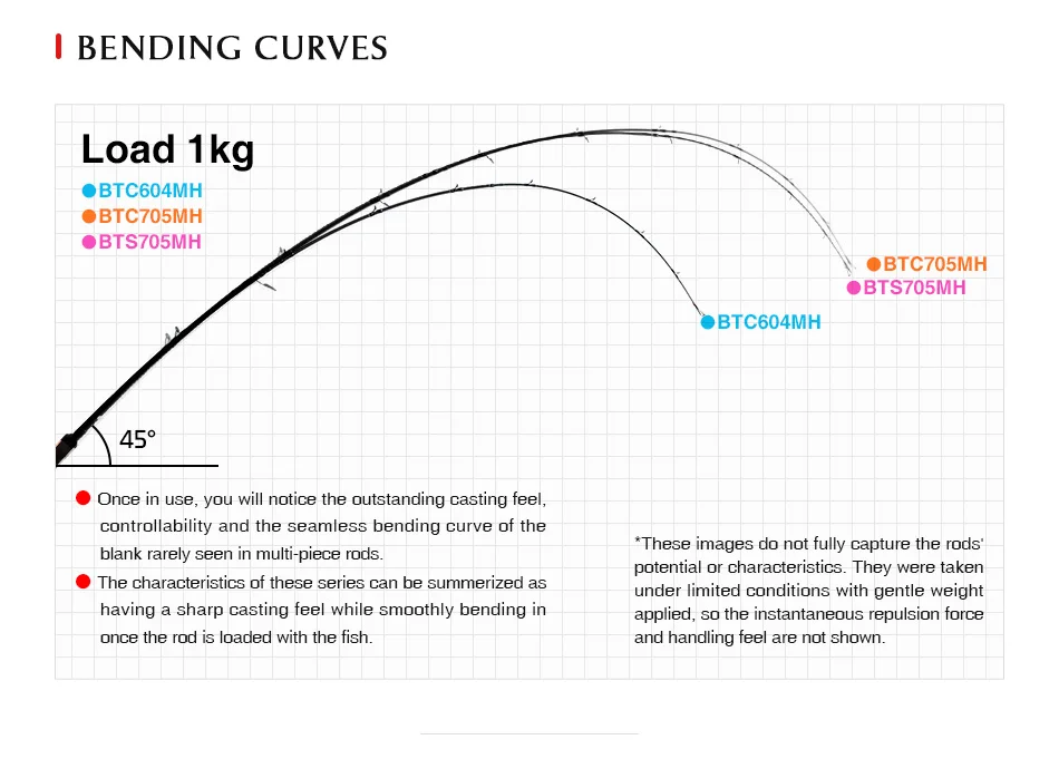 ● The characteristics of these series can be summerized as having a sharp casting feel while smoothly bending in once the rod is loaded with the fish.