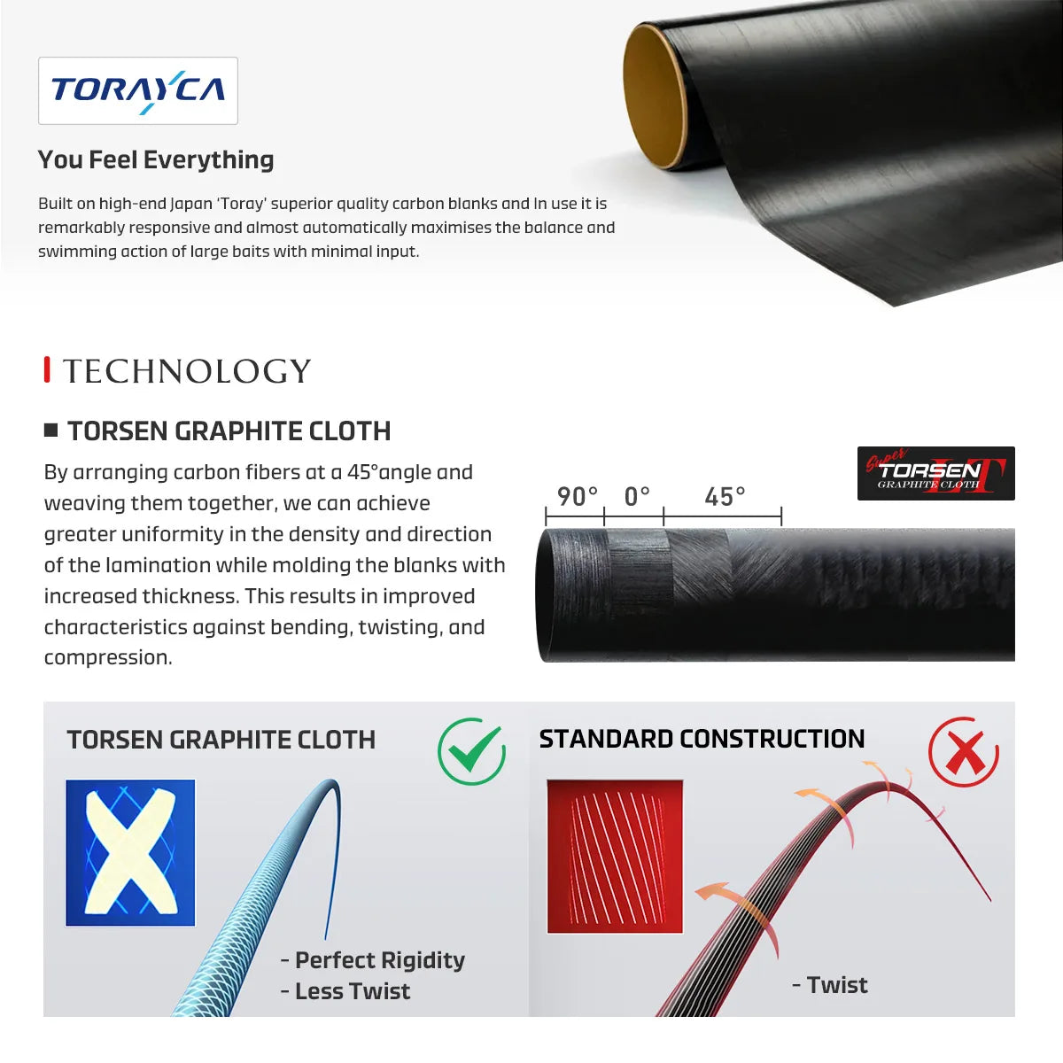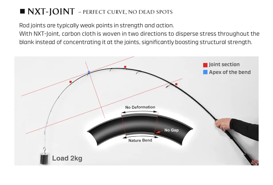 Rod joints are typically weak points in strength and action. With NXT-Joint, carbon cloth is woven in two directions to disperse stress throughout the blank instead of concentrating it at the joints, significantly boosting structural strength.