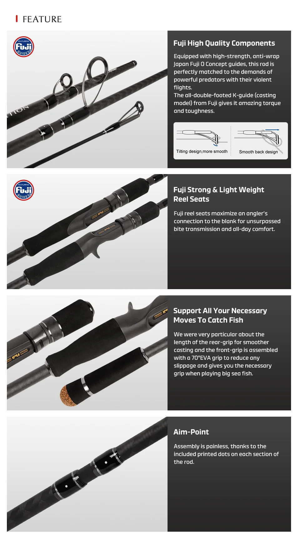 ● Once in use, you will notice the outstanding casting feel, controllability and the seamless bending curve of the blank rarely seen in multi-piece rods.