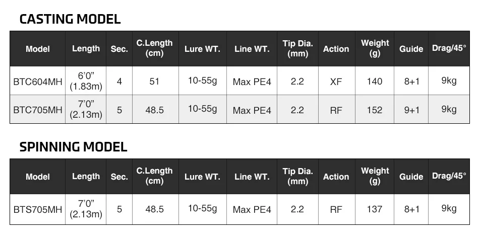 BTS 705 MH : Featuring a powerful new blank with abundant torque and recovery, the BTS705MH excels as an all-rounder spinning rod with exceptional long-distance castability. It easily casts 40g bait while controlling lures from 10g to 55g, delivering versatile performance. Its 7’0” length enables effective fishing from both boat and shore, and the long grip design is ideal for big bait casting and battling monster fish.