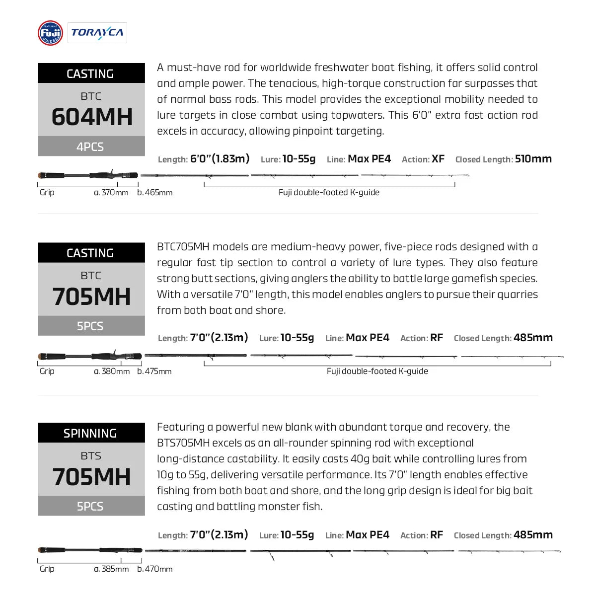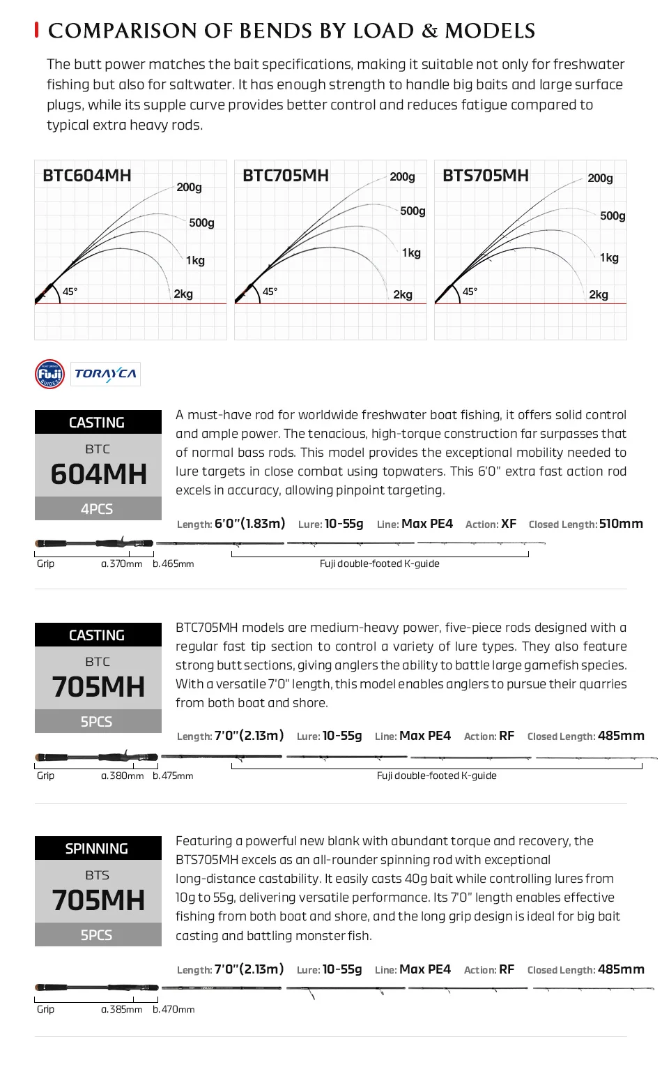 BTC 705 MH: BTC705MH models are medium-heavy power, five-piece rods designed with a regular fast tip section to control a variety of lure types. They also feature strong butt sections, giving anglers the ability to battle large gamefish species. With a versatile 7’0” length, this model enables anglers to pursue their quarries from both boat and shore.