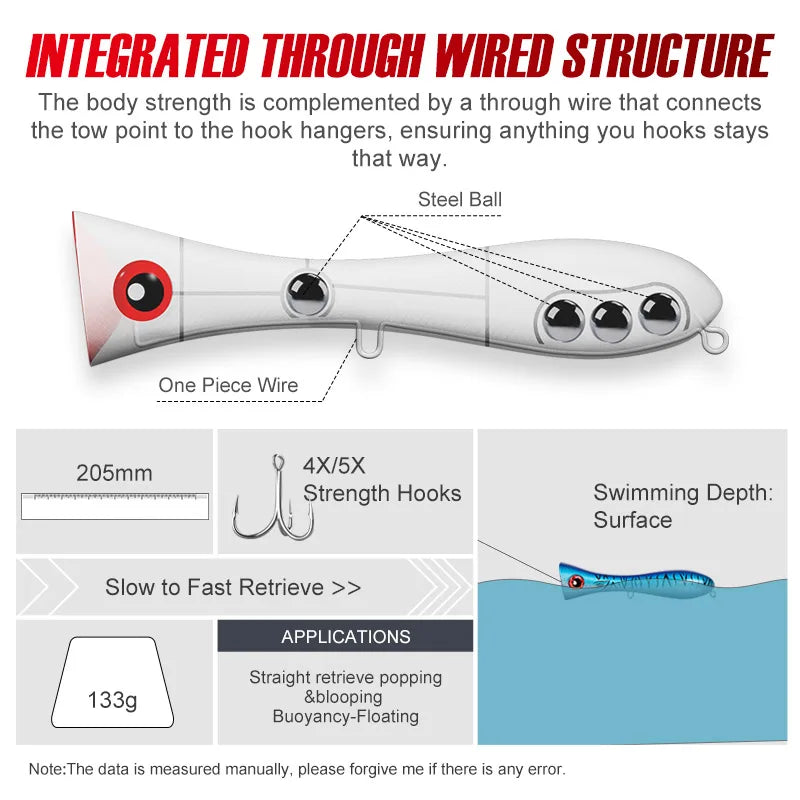 Noeby Big Game Popper Fishing Lure 205mm 133g Topwater Popper Artificial Hard Bait 4/5X Hooks for Heavy Sea GT Tuna Fishing Lure
