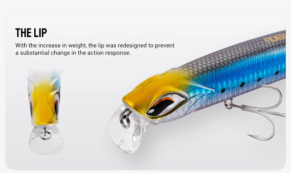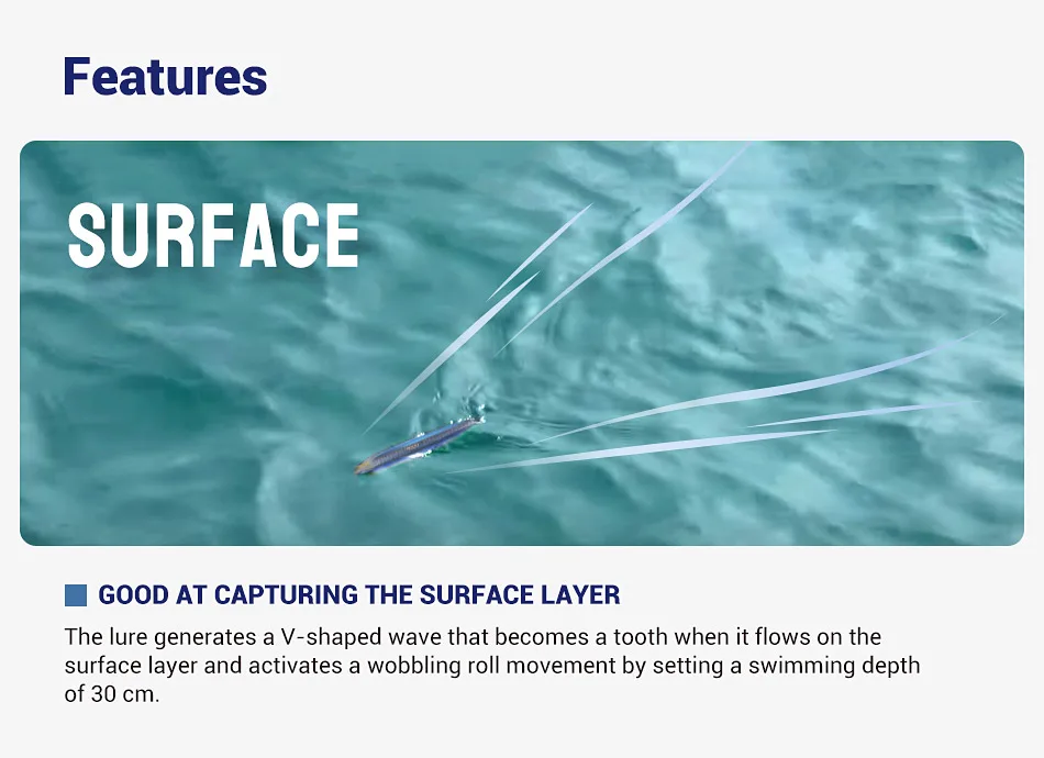 The lure generates a V-shaped wave that becomes a tooth when it flows on the surface layer and activates a wobbling roll movement by setting a swimming depth of 30cm.
