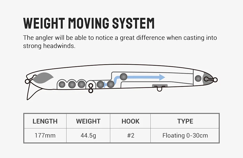 Weight moving system, the angler will be able to notice a great difference when casting into strong headwinds.