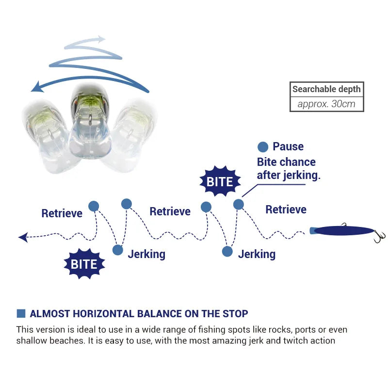 This version is ideal to use in a wide range of fishing spots like rocks, ports or even shallow beaches. It is easy to use, with the most amazing jerk and twitch action.