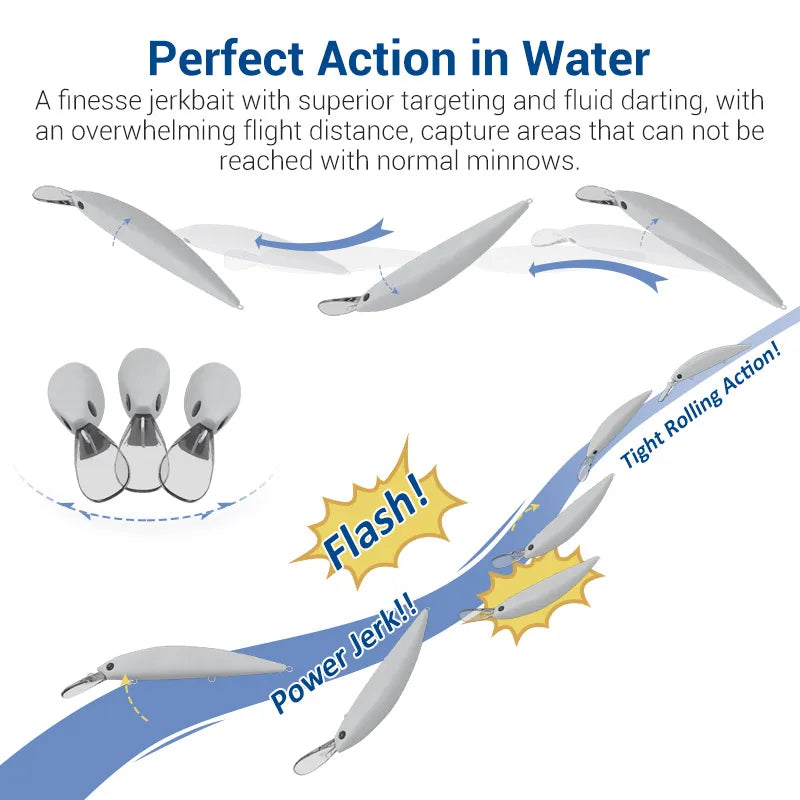 A finesse jerkbait with superior targeting and fluid darting, with an overwhelming flight distance, capture areas that can not be reached with normal minnows.