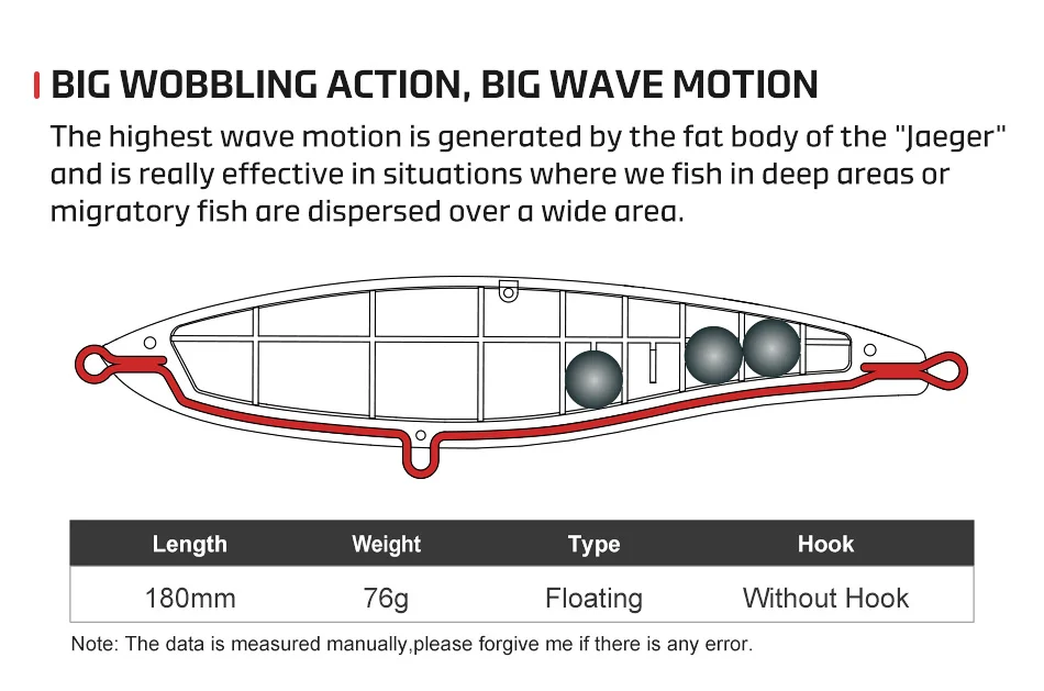 The highest wave motion is generated by the fat body of the Jaeger and is really effective in situations where we fish in deep areas or migratory fish are dispersed over a wide area.
