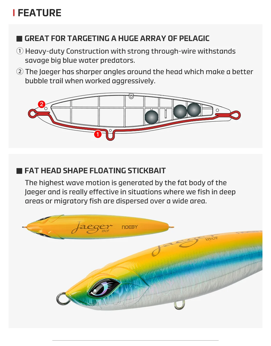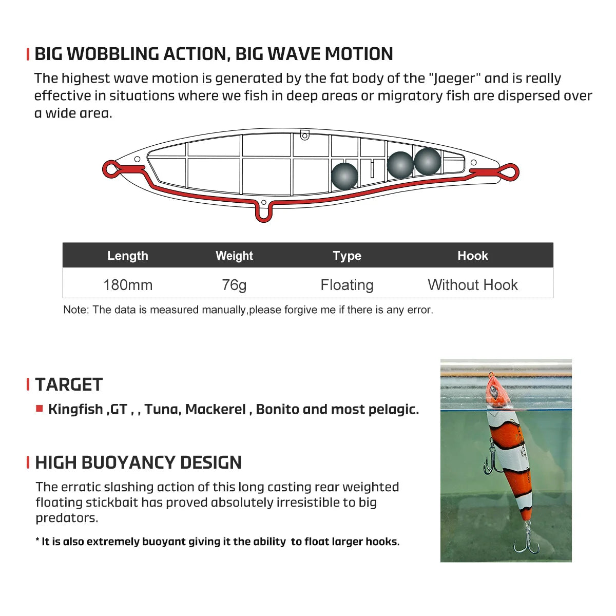 NOEBY Jaeger Stickbait Fishing Lure 180mm 76g Floating Pencil Artificial Hard Bait Saltwater Big Game Tuna GT Fishing Lures