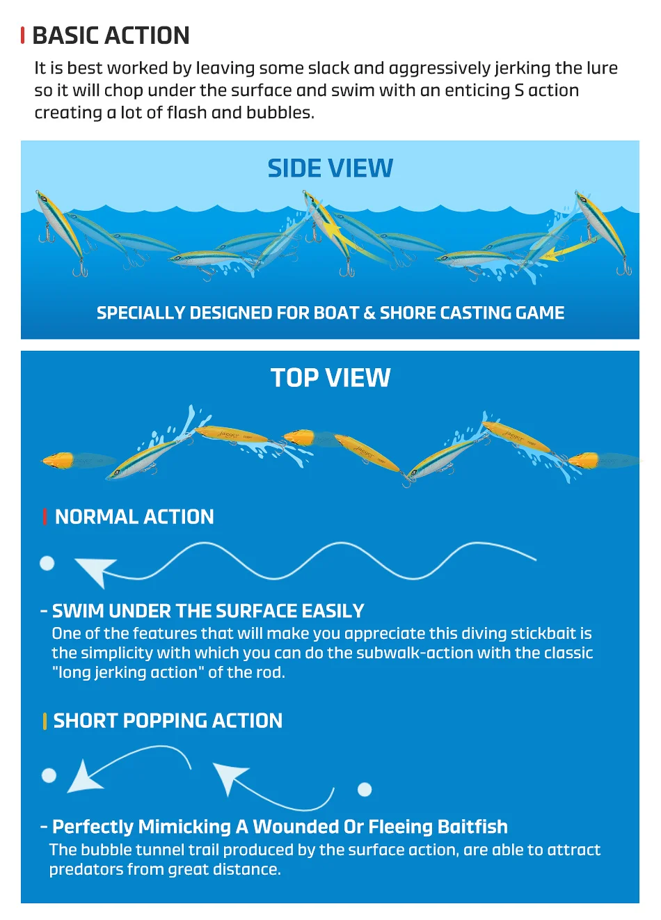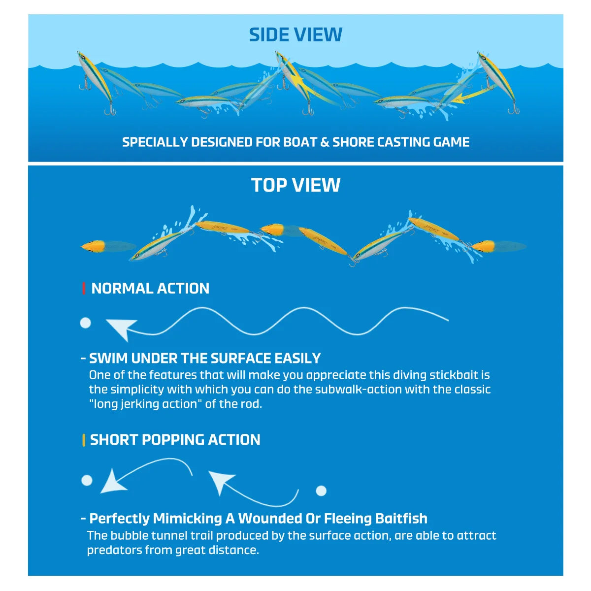 - One of the features that will make you appreciate this diving stickbait is the simplicity with which you can do the subwalk-action with the classic "long jerking action" of the rod.