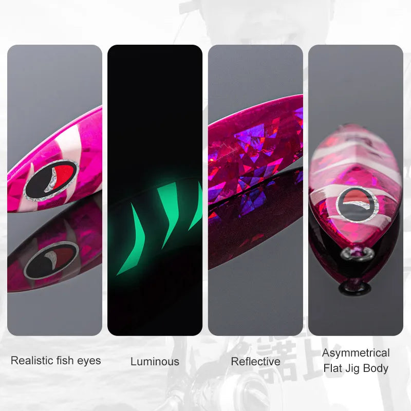 Luminous effect body design- Luminous jigging lure glow in the dark water or murky waters and make it more attractive to target various species fishes.