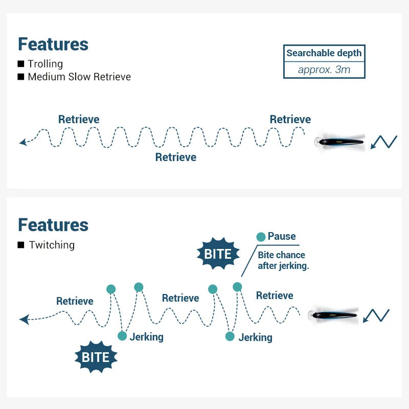 Trolling speeds ranging from 1 knot to 7 knots are ideal and twitching of the rod at low trolling speeds will achieve action with a more erratic movement.