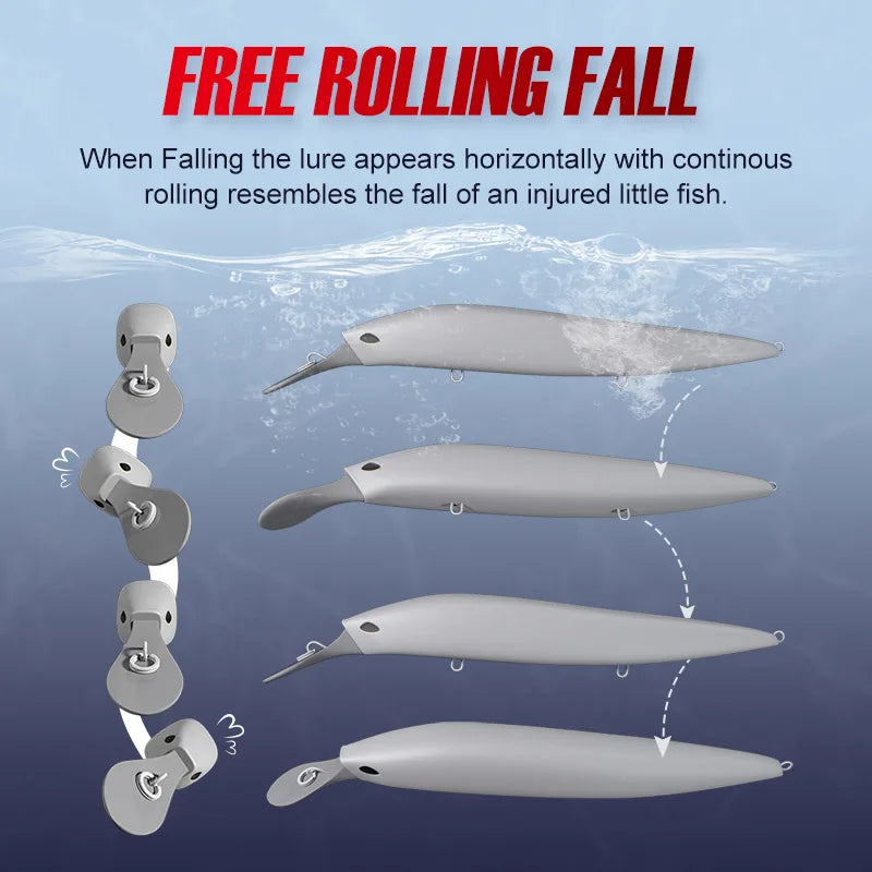 2. Free Rolling Fall- When falling the lure appears horizontally with continous rolling resembles the fall of an injured little fish.