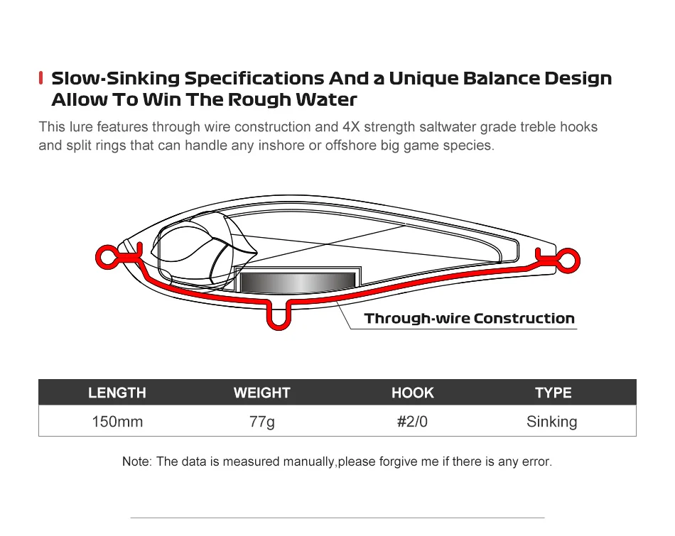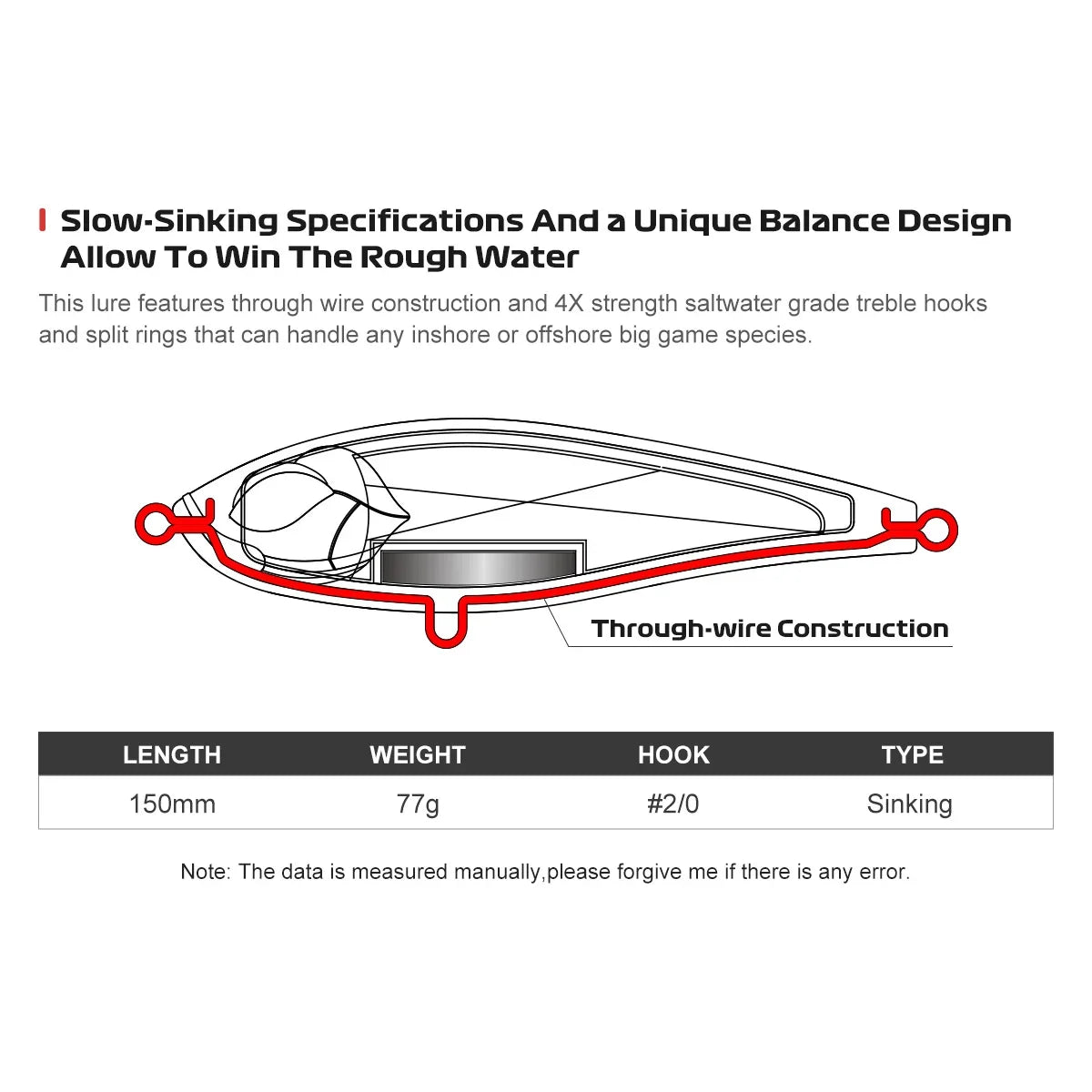 Noeby Offshore Twitch Bait Fishing Lure 150mm 77g Sinking Jerkbait Heavy Duty 4X Hooks Artificial Hard Bait Fishing Lures