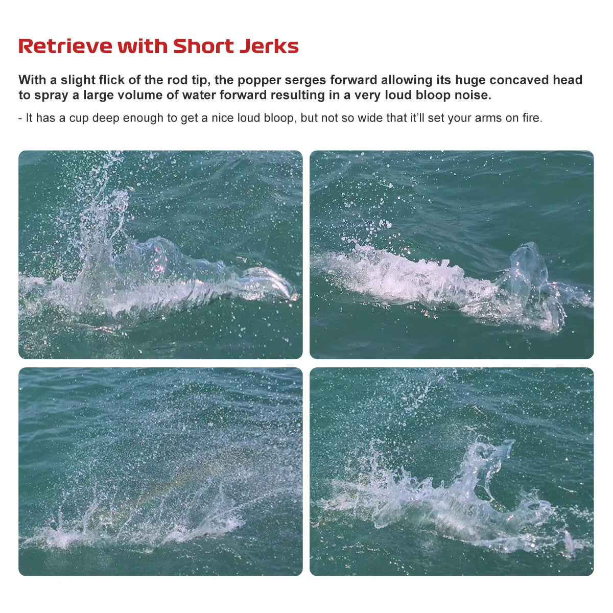 With a slight flick of the rod tip, the popper serges forward allowing its huge concaved head to spray a large volume of water forward resulting in a very loud bloop noise.