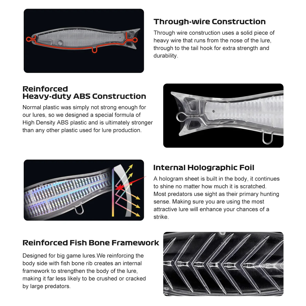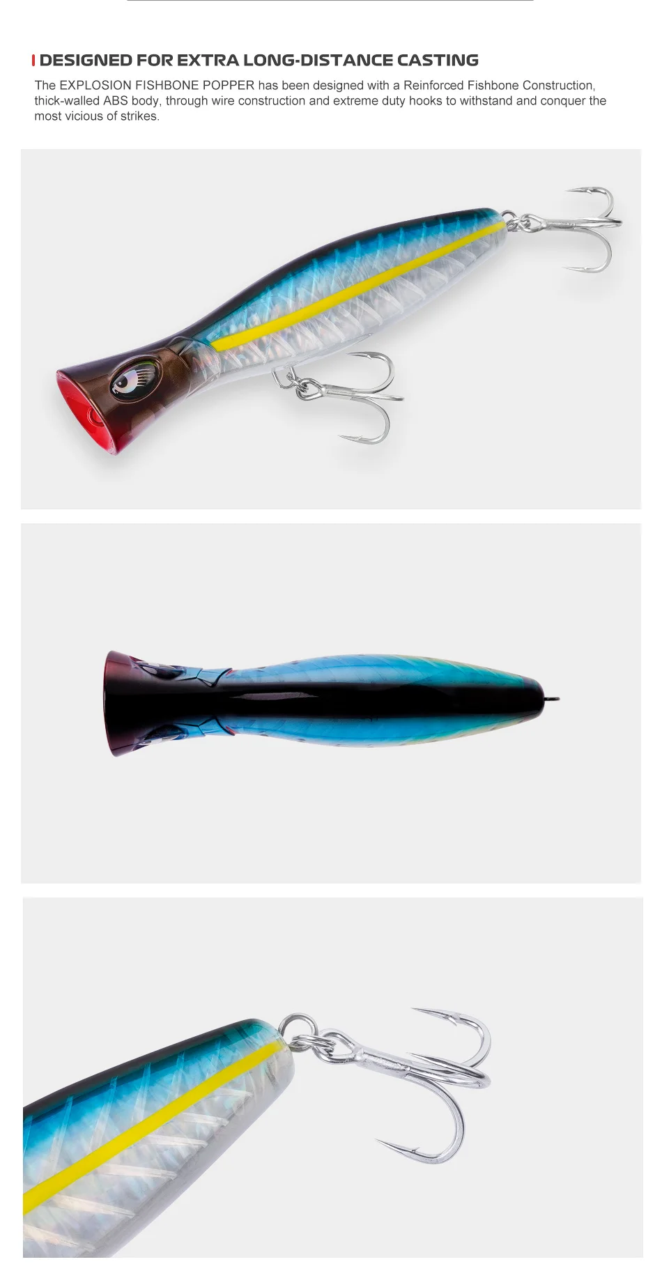 The EXPLOSION FISHBONE POPPER has been designed with a Reinforced Fishbone Construction, thick-walled ABS body, through wire construction and extreme duty hooks to withstand and conquer the most vicious of strikes.