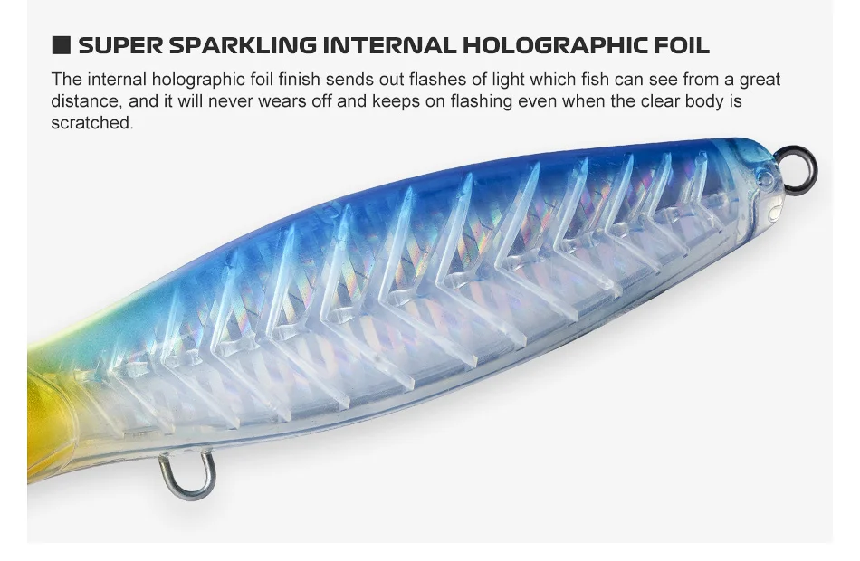 The internal holographic foil finish sends out flashes of light which fish can see from a great distance, and it will never wears off and keeps on flashing even when the clear body is scratched.