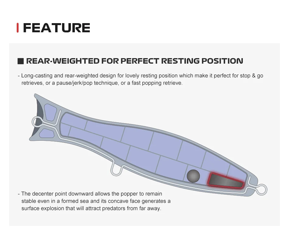 - Long-casting and rear-weighted design for lovely resting position which make it perfect for stop & go retrieves, or a pause/jerk/pop technique, or a fast popping retrieve.