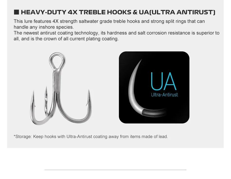 Heavy duty 4X treble hooks & UA(ultra antirust)