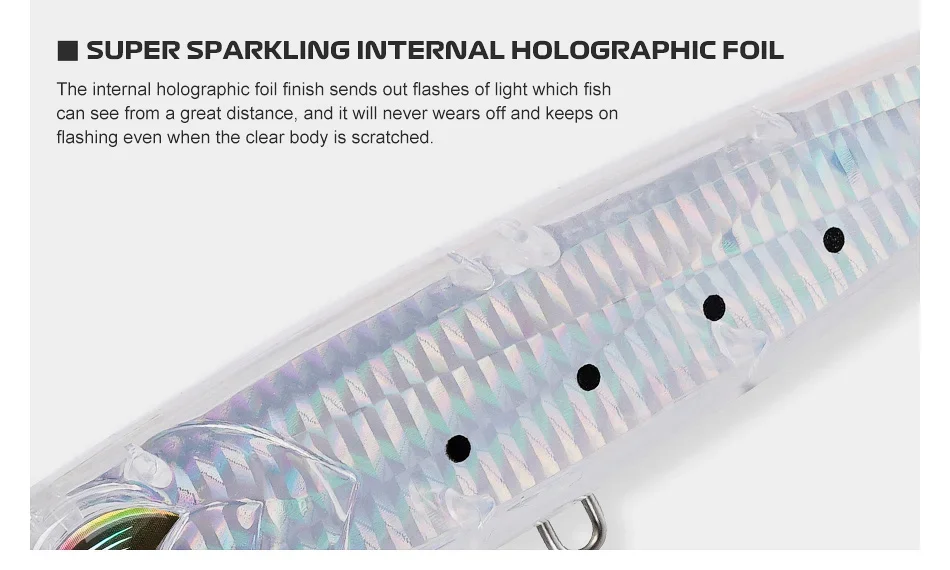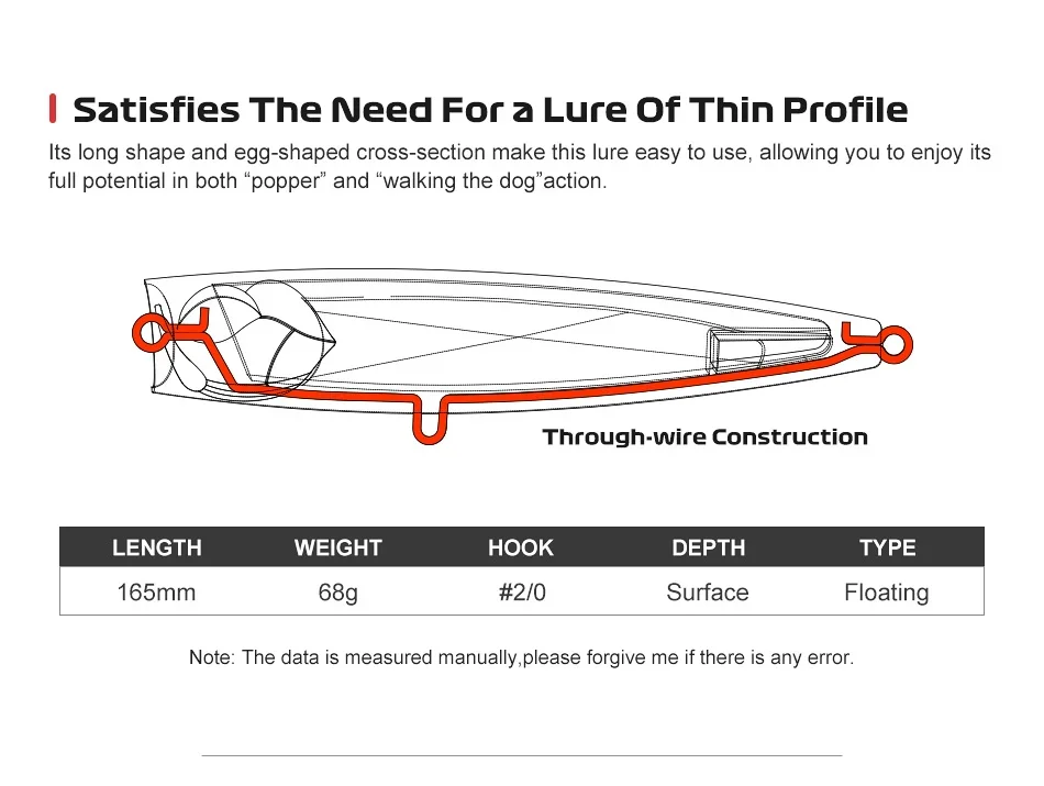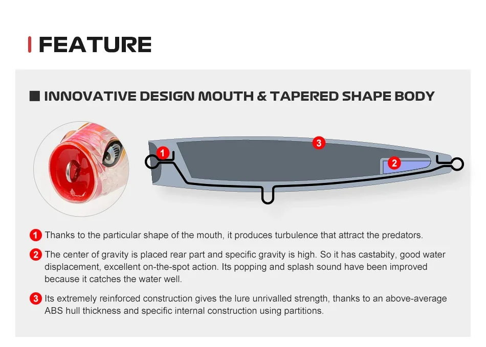 Its long shape and egg-shaped cross-section make this lure easy to use, allowing you to enjoy its full potential in both "popper" and "walking the dog" action.