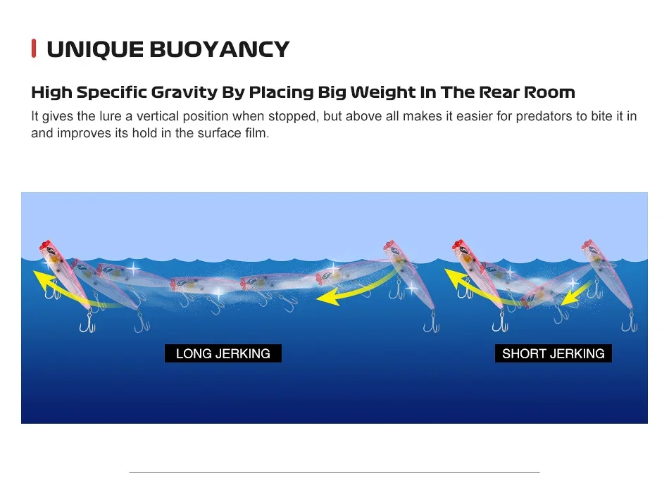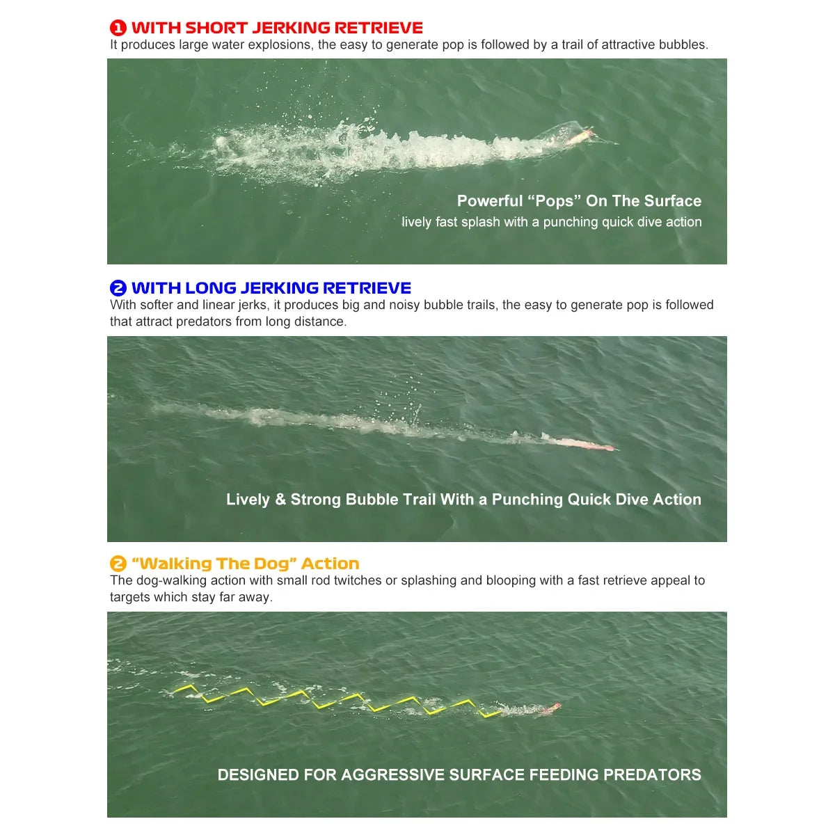 With long jerking retrieve. With softer and linear jerks, it produces big and noisy bubble trails, the easy to generate pop is followed that attract predators from long distance.