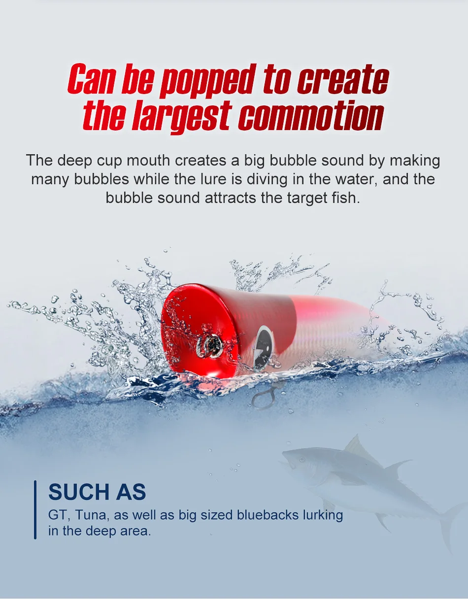 The deep cup mouth creates a big bubble sound by making many bubbles while the lure is diving in the water, and the bubble sound attracts the target fish.