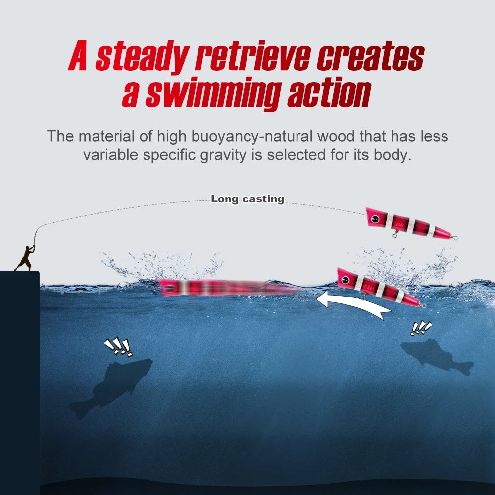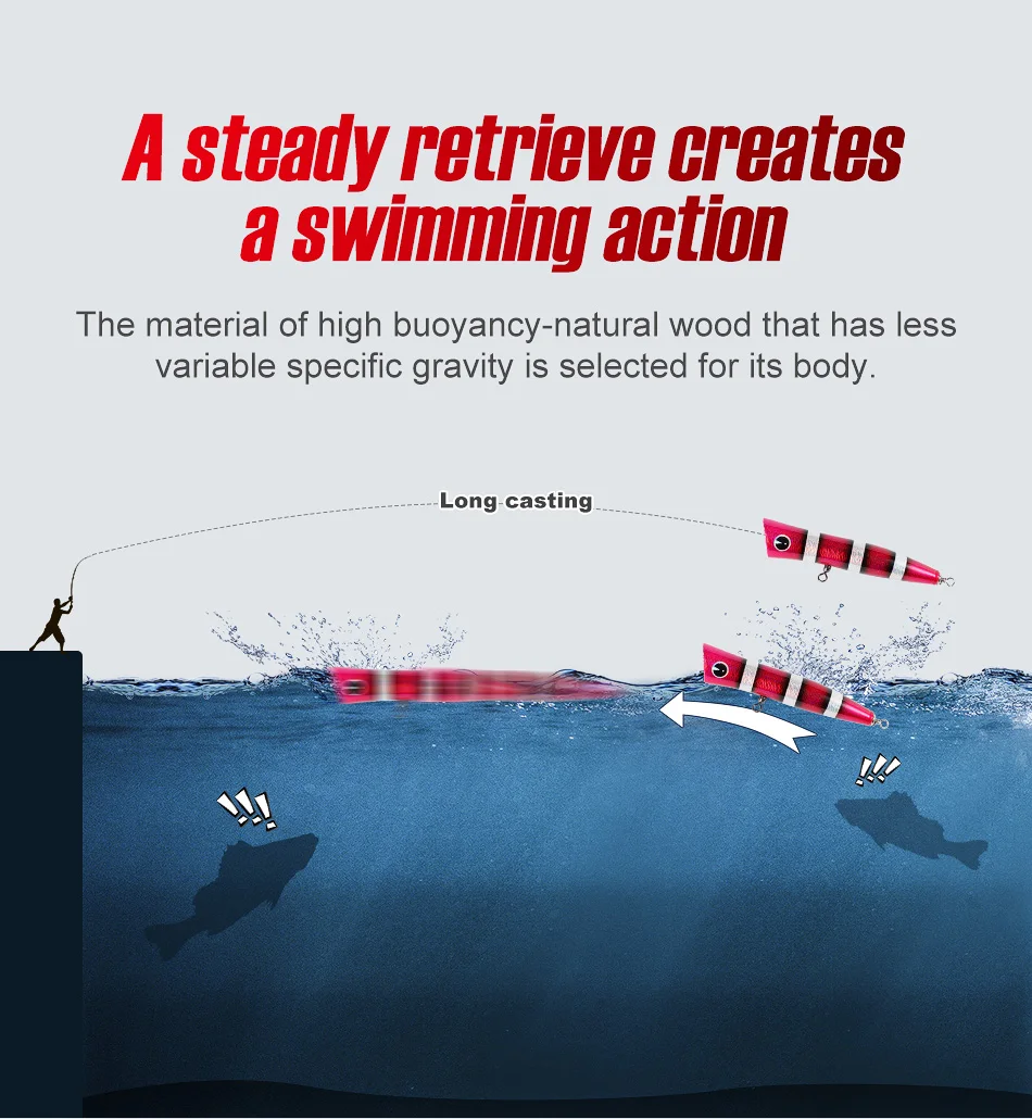 A steady retrieve creates a swimming action. The material of high buoyancy-natural wood that has less variable specific gravity if selected for its body.