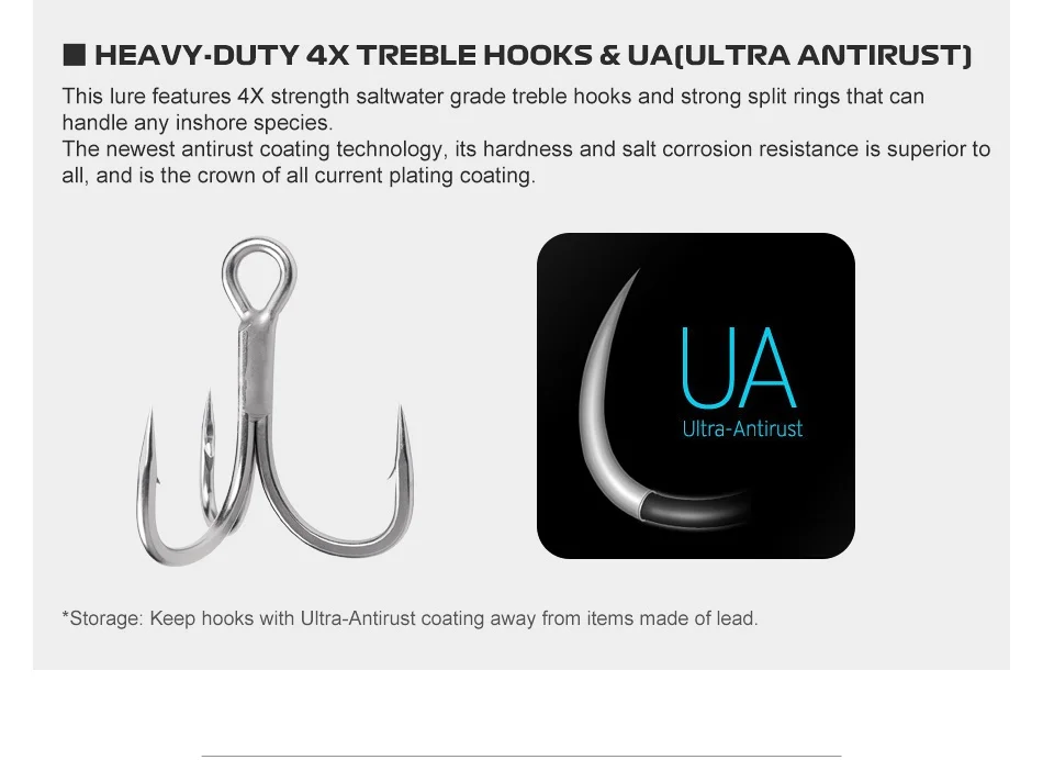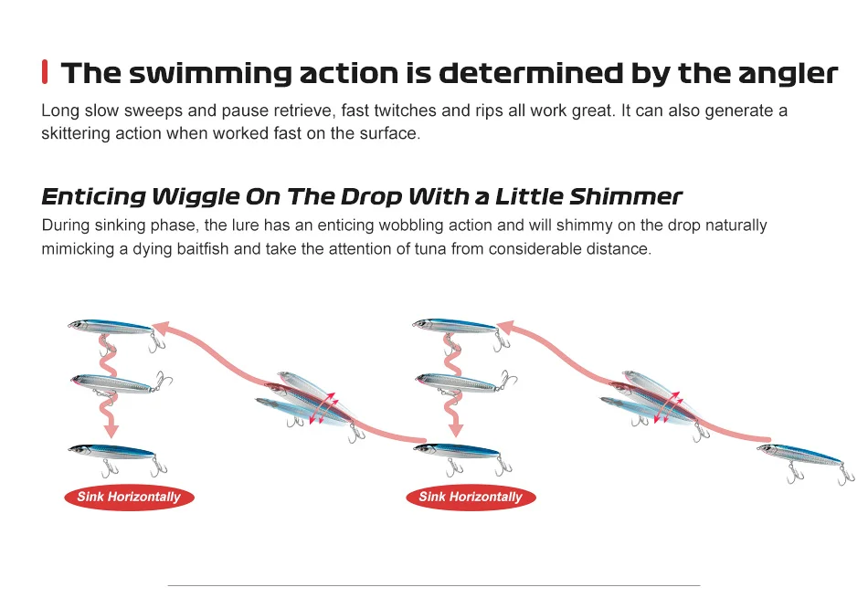 During sinking phase, the lure has an enticing wobbling action and will shimmy on the drop naturally mimicking a dying baitfish and take the attention of tuna from considerable distance.