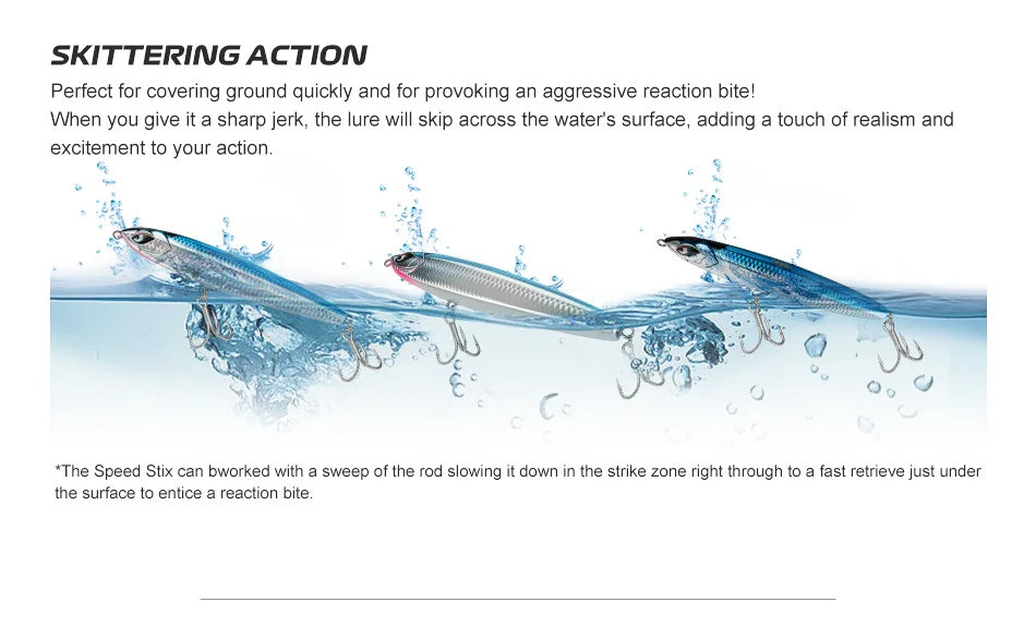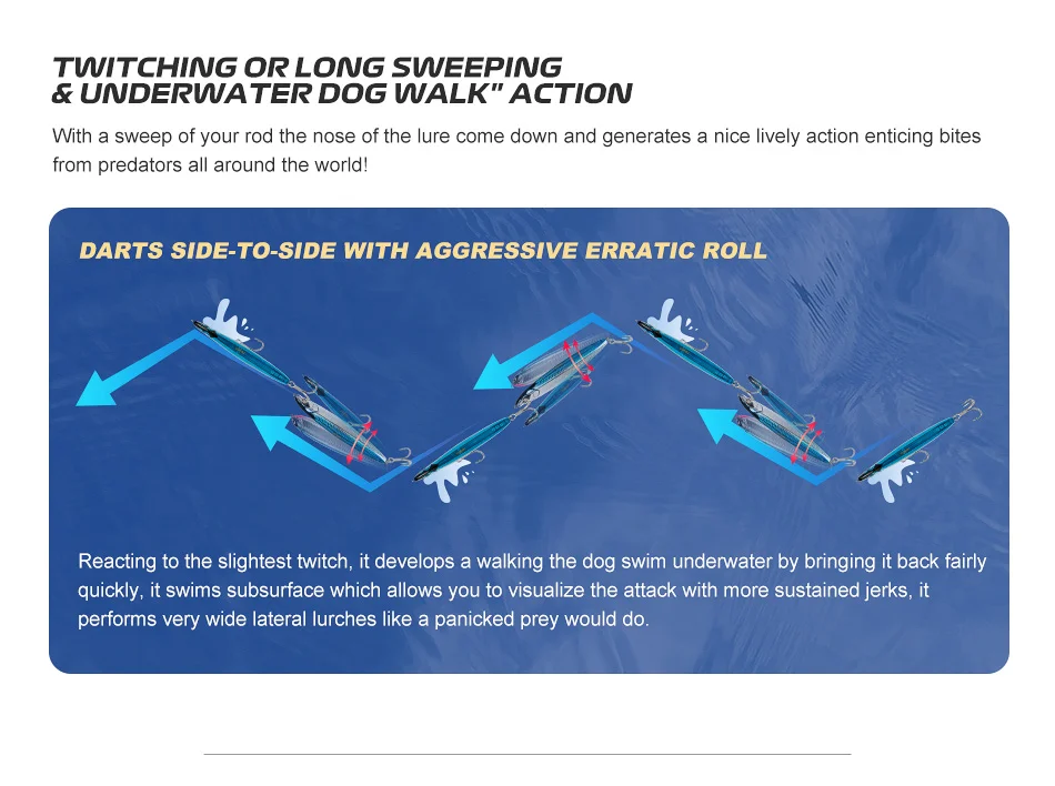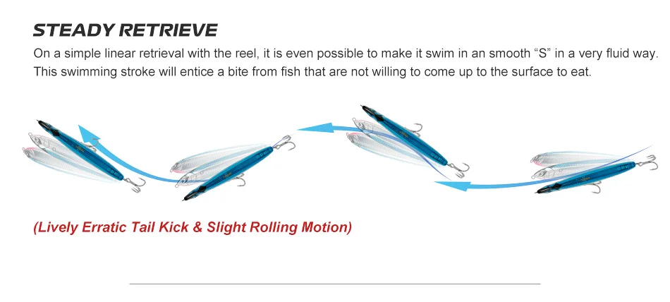 Long slow sweeps and pause retrieve, fast twitches and rips all work great. It can also generate a skittering action when worked fast on the surface.