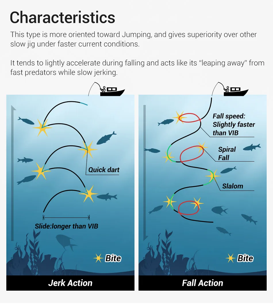 This type is more oriented toward jumping and gives superiority over other slow jig under faster current conditions.