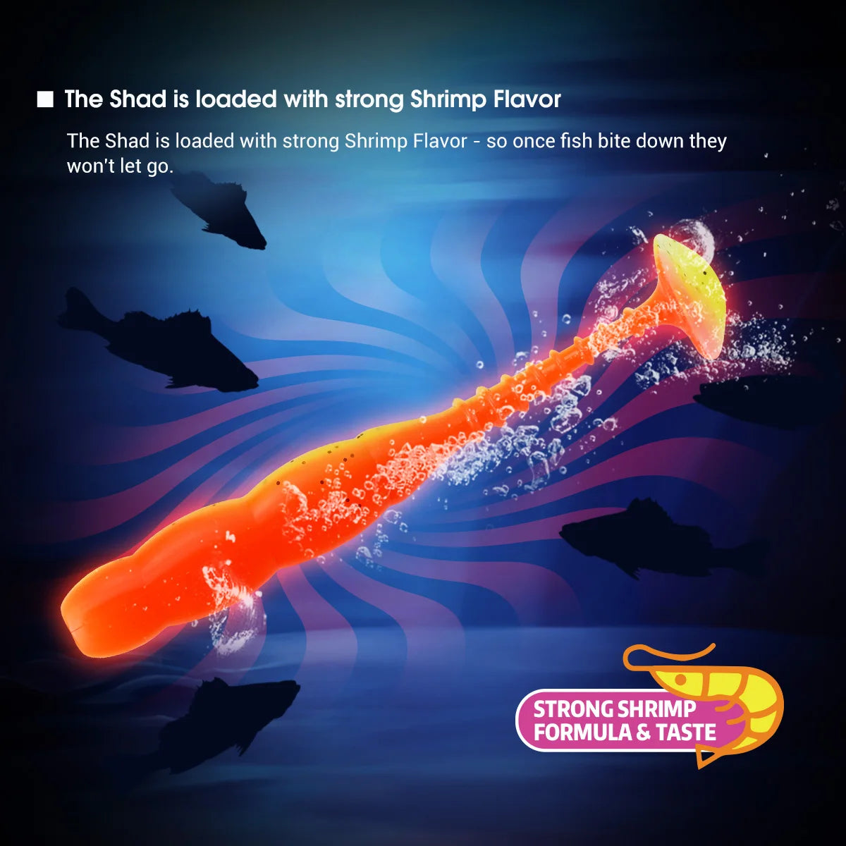 The shad is loaded with strong shrimp flavor- so once fish bite down they won't let go.